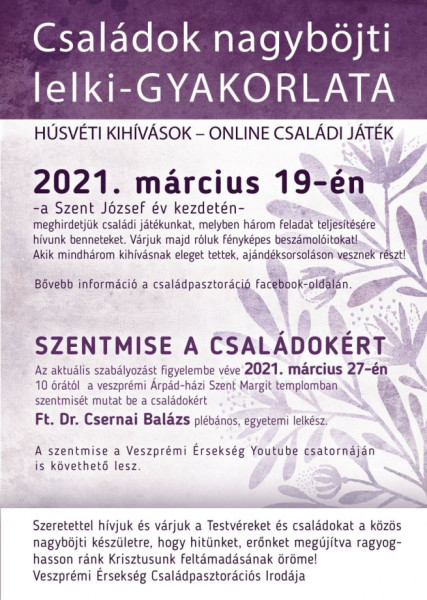A Veszprémi Főegyházmegye Családpasztorációs Irodája a járványhelyzet adta lehetőségek közepette is igyekszik a családokra figyelni, velük kapcsolatot tartani. Ennek részeként Húsvéti kihívások címmel játékot hirdettek, valamint online követhető családos misét is szerveznek.
